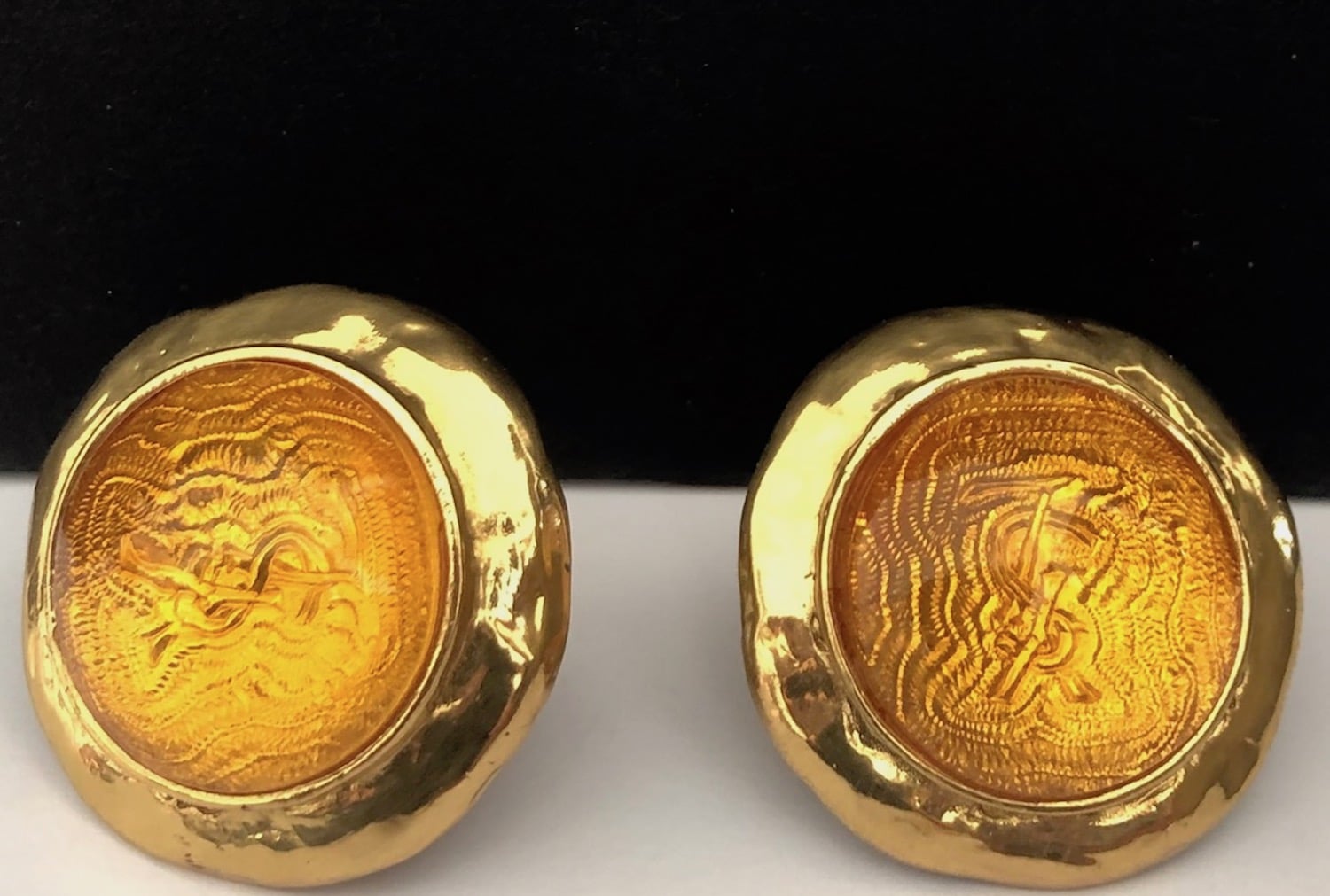 YVES SAINT LAURENT By GOOSSENS Vintage YSL Citrine Cabochons Earrings C.1990s. A stunning very rare, big pair of YSL clip-on by Goossens, hammered gold tone earrings, enhanced with a citrine-style resin cabochon engraved with YSL logo and wave motif on the inside background. A ‘Must-Have’ rare, sought after Goossens piece increasing in value. Monsieur Bijou was the moniker given to Robert Goossens, a French jeweller who lived from 1927 to 2016. He was born in Paris, France, the son of a metal foundry worker. During his jewellery-making apprenticeship, he learned the techniques of casting, engraving, and embossing semi-precious and simulated stones into gold and silver metals. Goossens combined genuine stones with fakes, artificial gems with semi-precious for clients such as Coco Chanel, Cristóbal Balenciaga, Yves Saint Laurent, Madame Grès, Christian Dior, and others during his decades of making fine jewellery.