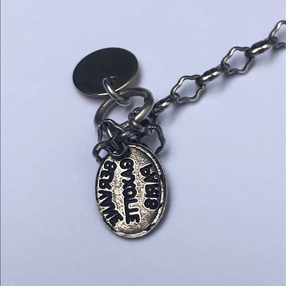 It is a cute, very girly long chain necklace with a little girl pendant from the French designer Servane Gaxotte. She designed a collection of necklace with various style of articulated little girl pendant expressing her strong taste for an everlasting childhood. A long chain necklace handcrafted in silver plated with an articulated little girl pendant in silver and Python skin. The little girl has articulated head, legs and arms. She is carrying a small heart bag in gold tone. Her dress is made of python skin with three gold tone cut pearl beads matching with her gold tone heart bag and she is wearing a beautiful lace up boots. The chain is silver plated with diagonal links and it is detachable from the pendant.