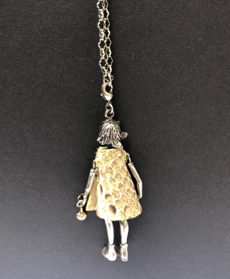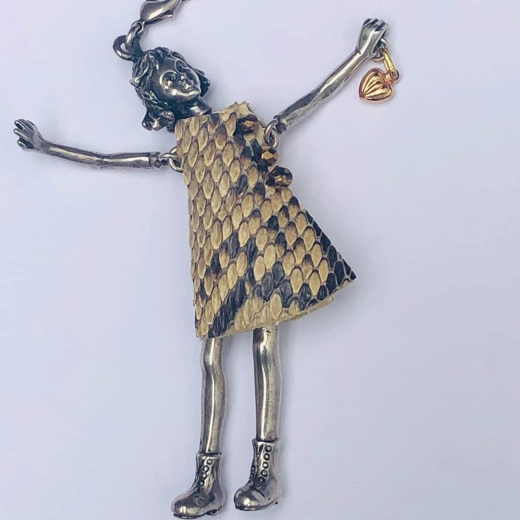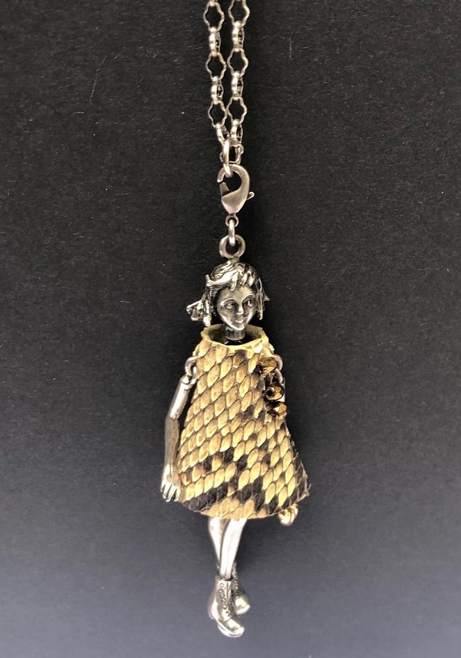 SERVANE GAXOTTE Hang Pendant Articulated Little Girl Long Chain Necklace Silver & Python Dress