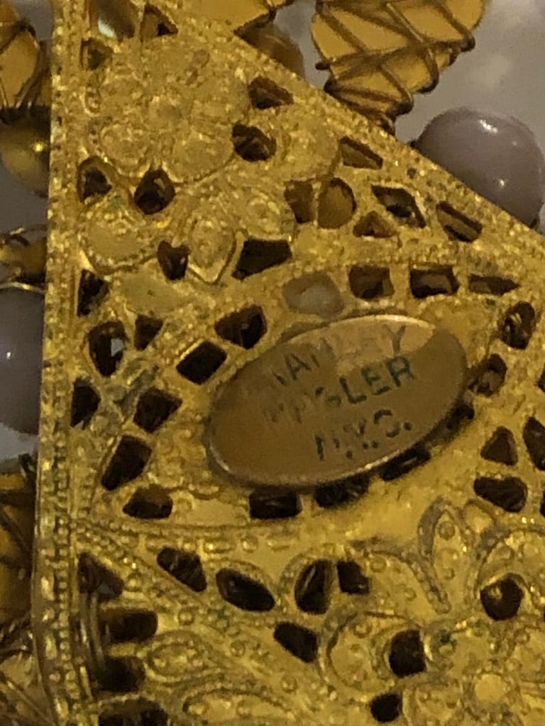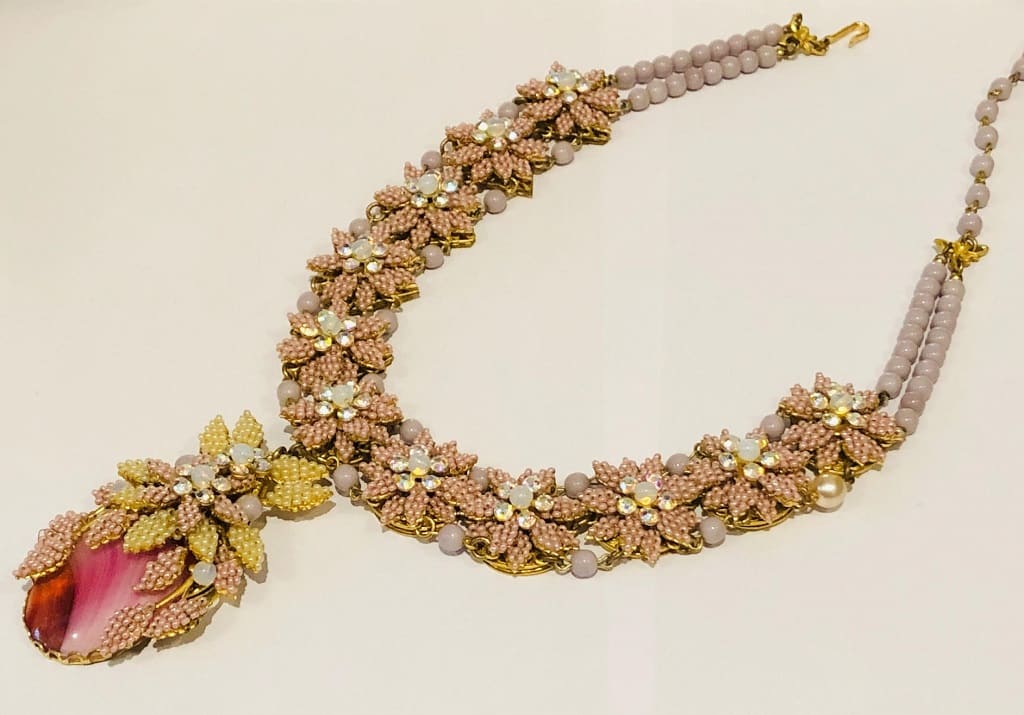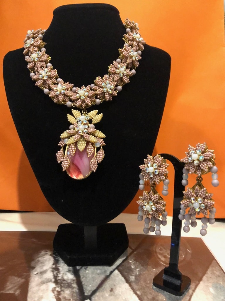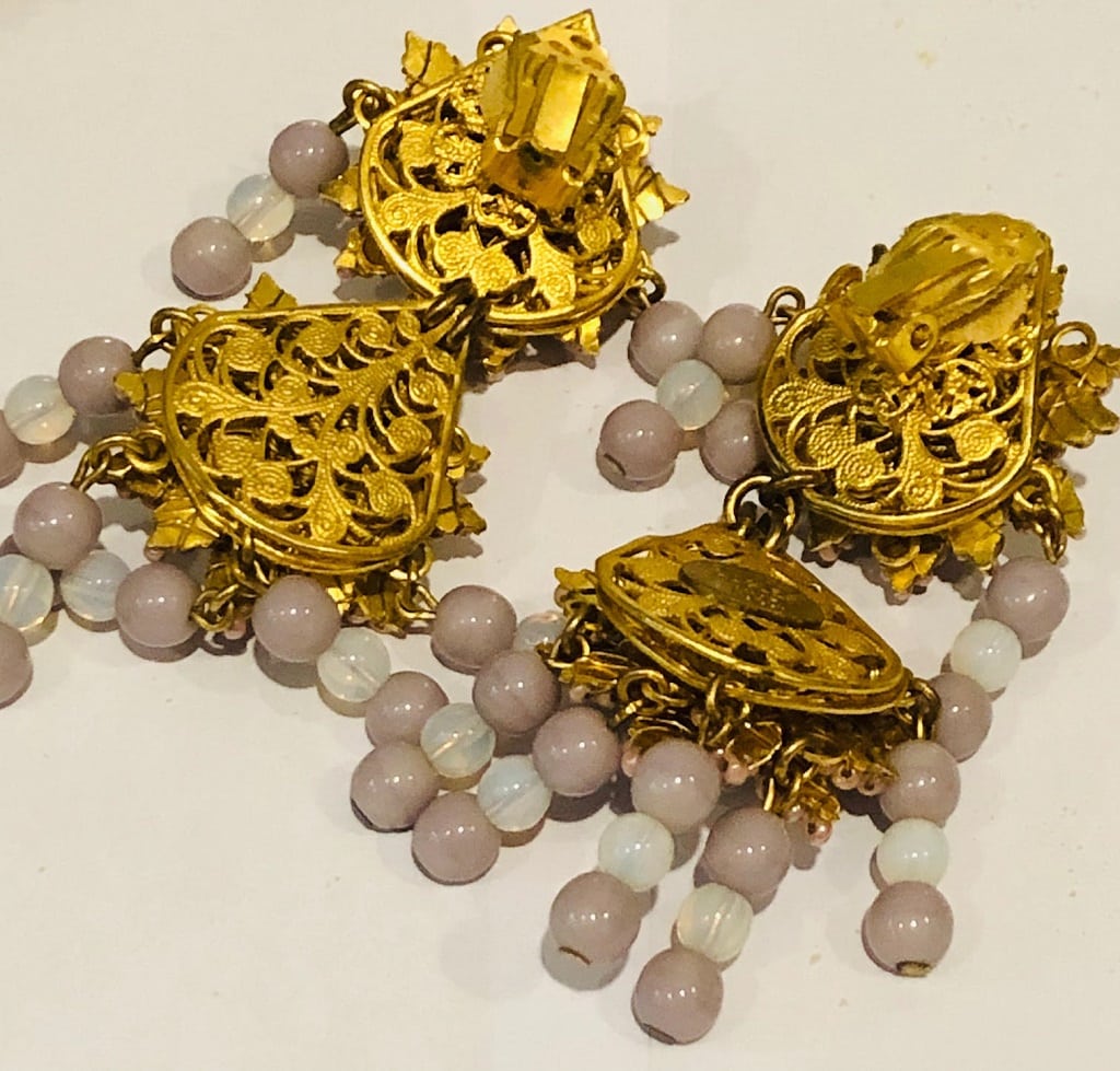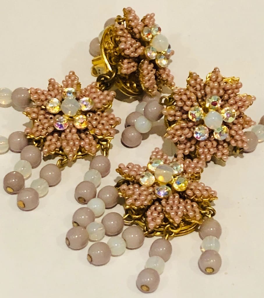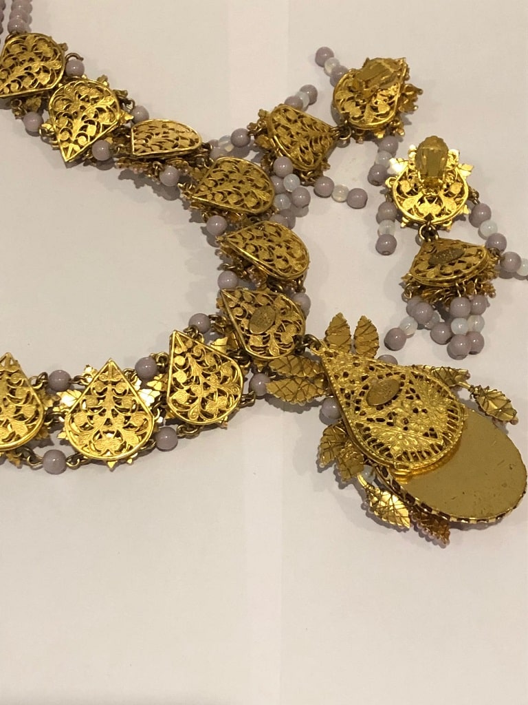 A stunning, rare and vintage statement piece from Stanley Hagler. A necklace and drop earrings set in the most beautiful shade of coral glass beads, crystal and rose quartz mounted in gilded metal filigree. Hagler’s jewellery is renowned for being lavish and vivid and the ‘seed’ beading, Swarovski crystals and Russian gold finished filigree metalwork are typical of his design. Many important women, Wallis the Duchess of Windsor and stars Sophia Lauren, Isabelle Adjani and many more wore both – high jewellery and costume. This Vintage Stanley Hagler is a stunning piece of vintage jewellery by an iconic American designer from New York City.