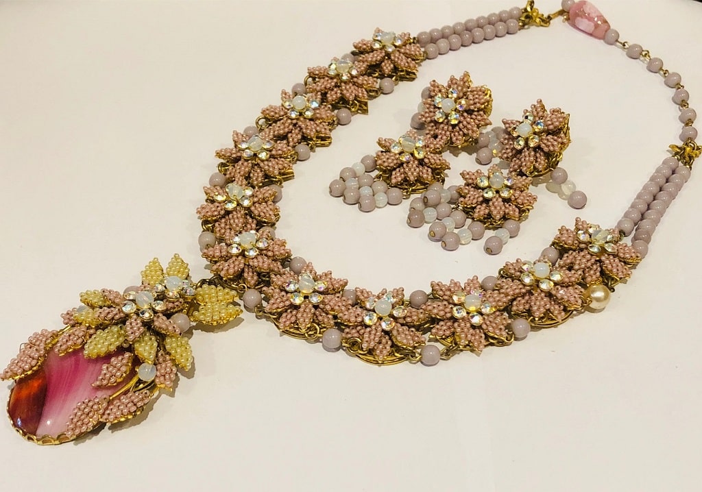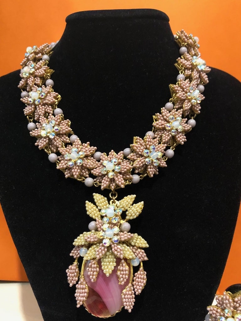 Stanley Hagler Necklace and Earrings Coral Glass Rose Quartz Crystal 1980s Rare CVC18040322.CUK33