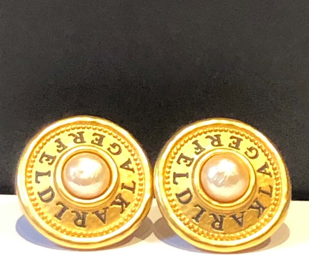 KARL LAGERFELD Vintage Iconic Logo Jumbo Earrings Gold Tone & Pearl