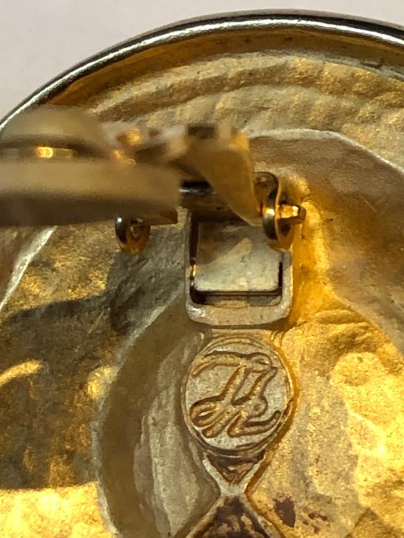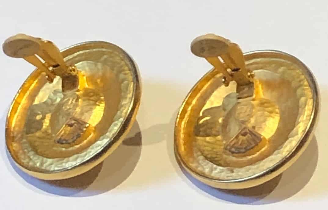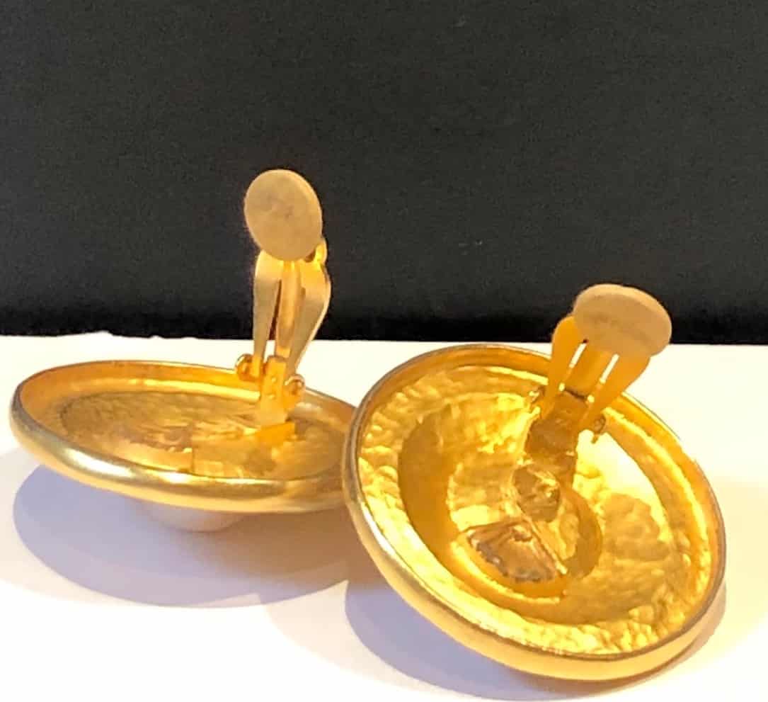 An iconic stunning rare, jumbo size Karl Lagerfeld earrings, ‘Chanel style’. The large circular Gold tone with the faux pearl embossed with Karl Lagerfeld name in Black characters all around the pearl make these clip-on earrings very desirable and stylish. Rare, Must-Have!