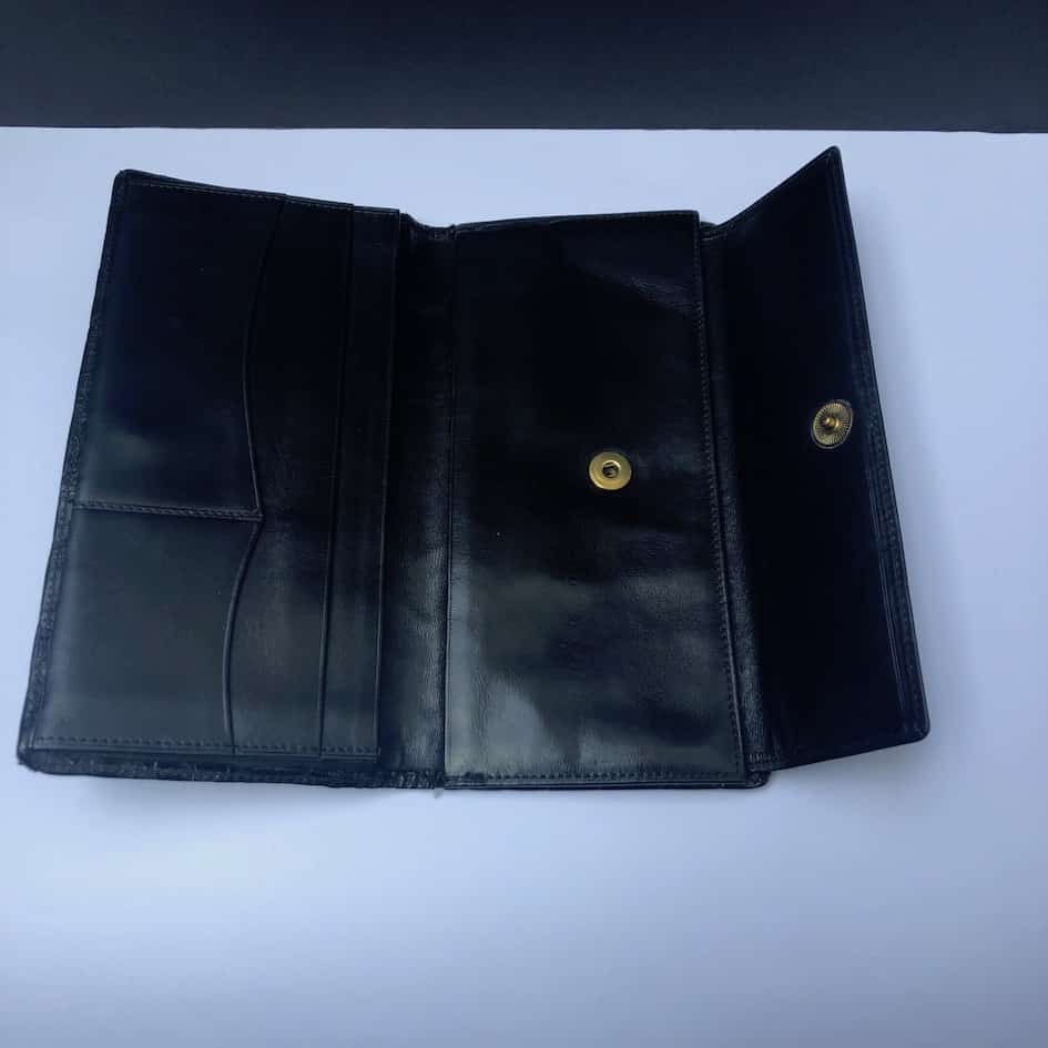 This beautiful vintage Circa 1970-1980s French wallet can be worn as an accessory or as a glamorous night small clutch. It is handcrafted from exotic Alligator Croc with luxurious glossy finish. Open strap that folds over both side of the wallet and slots for credit cards, bank notes, photos and change. The interior compartment is divided by four partition, one pocket with a stud button on one side and two flap pockets and credit cards slots on the other side. The wallet closes with an original Hermès button which was replaced at one stage. It is a unisex wallet ideal for everyone.