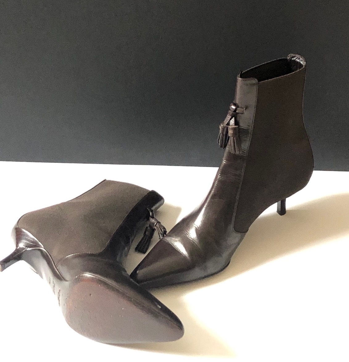 Yves Saint-Laurent a stunning stylish sleek chocolate brown leather and leather stretch ankle boots with kitten heels. Leather front with two tassels, the pointed toe is softly rounded, soft stitches on each side. Stretch leather on each side for easy access.