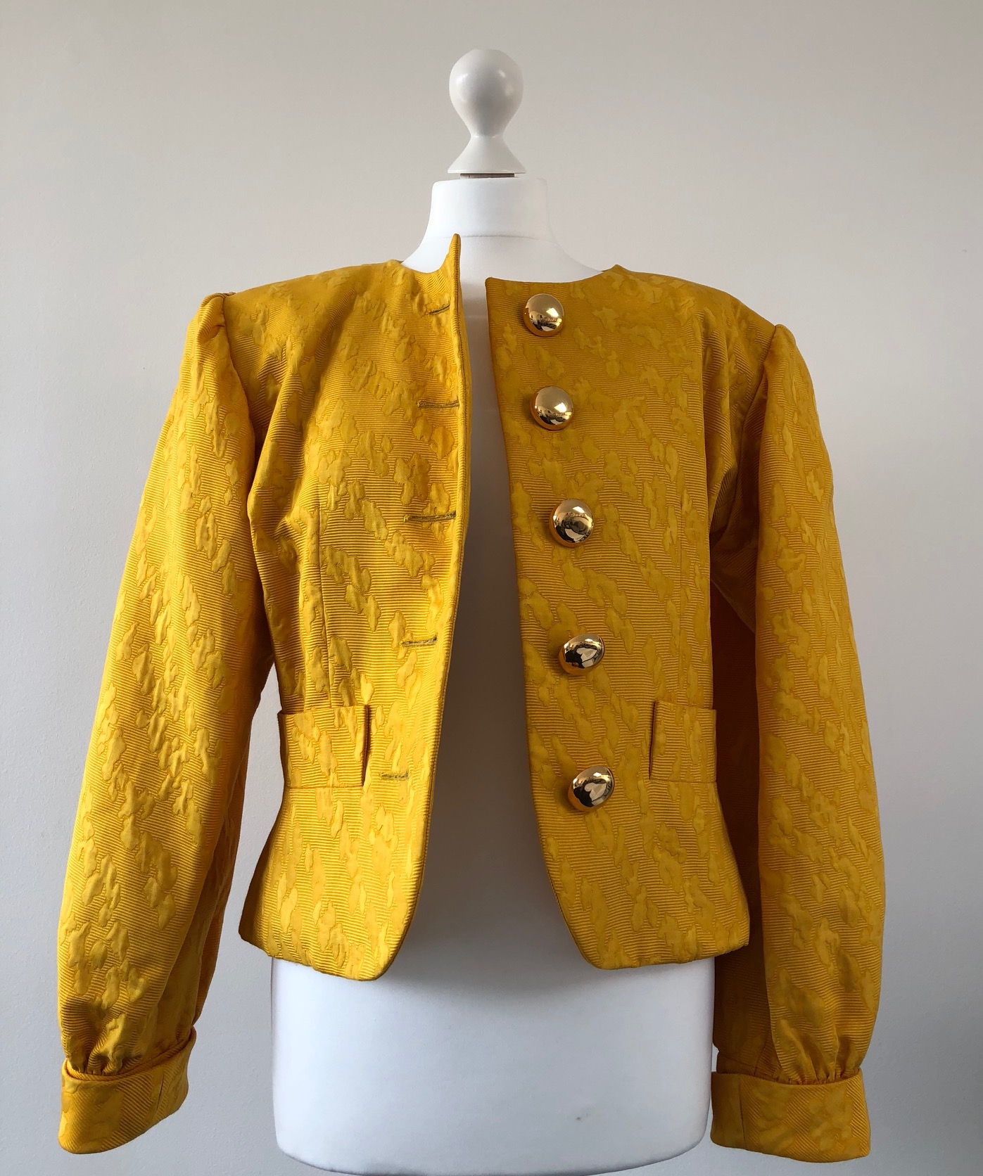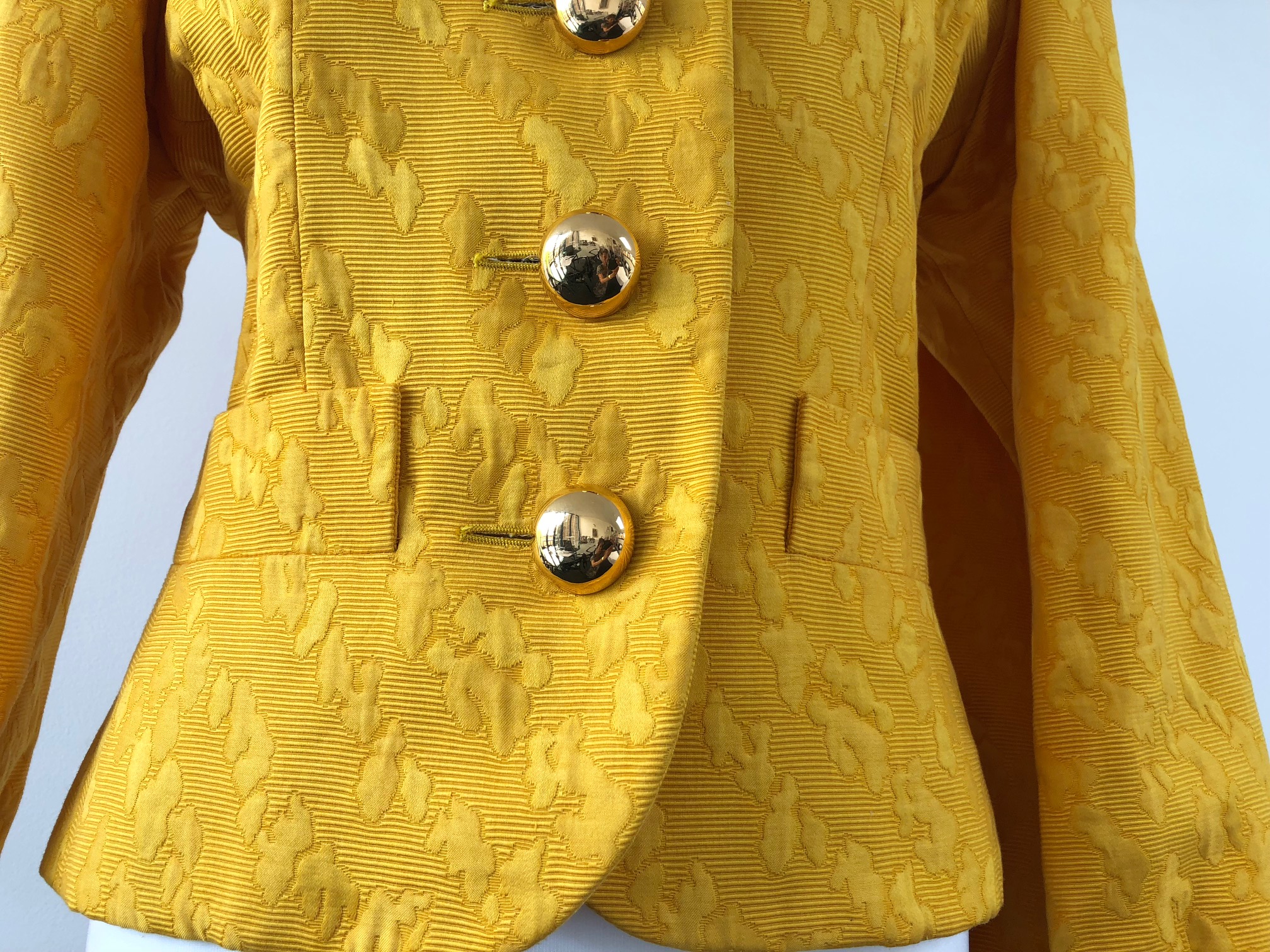 amazing craftsmanship piece, yellow-goldish luxury vintage jacket, damask print fabric, 2 side flap open pockets, long sleeves with cuffs, single-breasted closure, round neckline, beautiful large gold jewel buttons and shoulder pads. YSL archives jacket, collection spring / summer 1989 YSL catwalk fashion Paris.