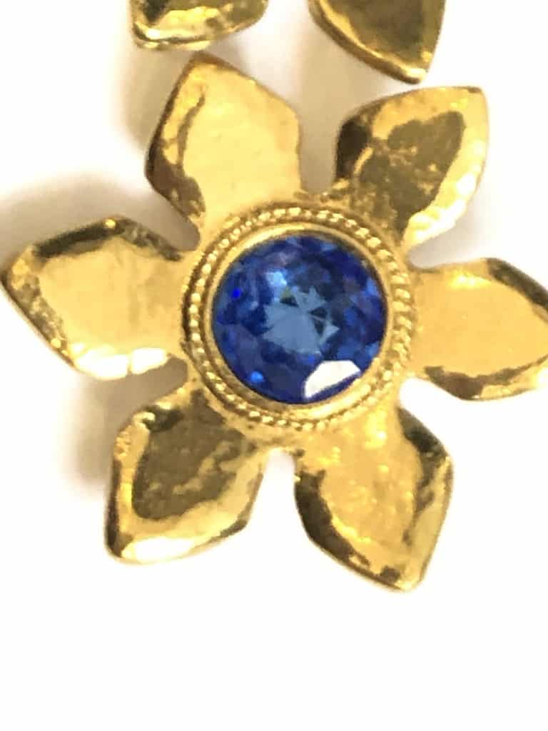A stunning pair of clip-on vintage flower and faceted cabochon earrings from YSL. A beautiful blue cabochon set in the center around a filigree gilded work. Signed YSL, made in France, behind each earring.