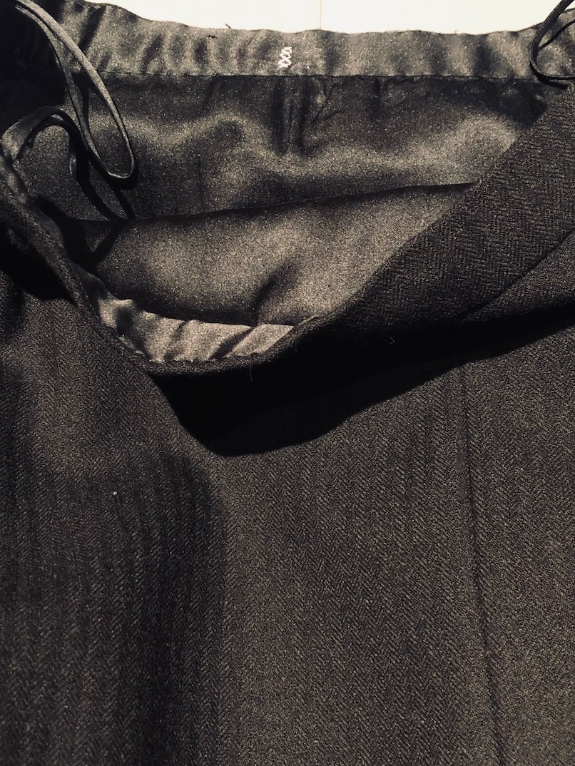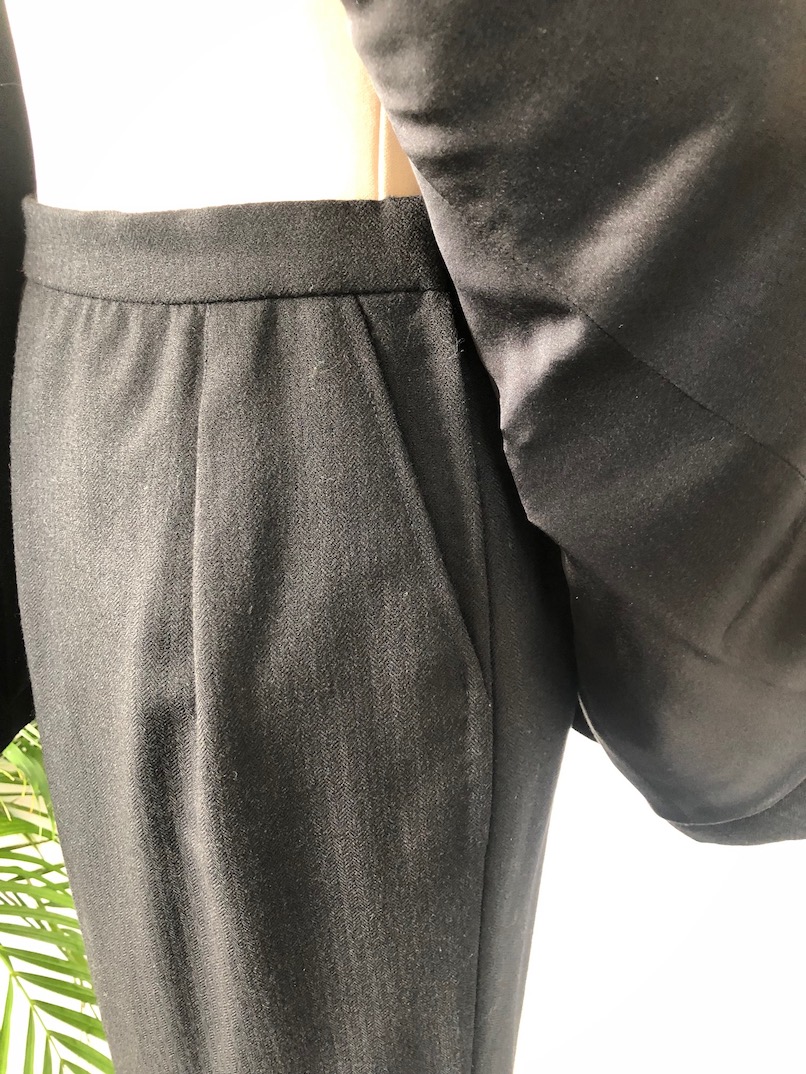 YVES SAINT-LAURENT Haute Couture no.67931 Circa 1991-1992. A very rare and stunning YSL Haute couture 3 pieces wool suit, a blazer, a trousers and a skirt handcrafted in pin stripe-herringbone pattern. A padded jacket with notched shawl collar, single-breasted jacket with a bakelite clover shape button, a chest pocket and two flap pockets, padded sleeves with 3 bakelite buttons. A straight mid length waistband fitted skirt with éclair zipper behind with four crosses sewn in white thread inside the waistband. A trousers identical to the jacket and skirt. A wide-leg trousers with 4 black leather belt loops, pleats in front and behind, large slit pockets, side zipper. The 3 pieces suit is fully lined in black silk fabric. This Haute couture suit is numbered and labelled. A ‘Must-Have’ iconic YSL Haute Couture suit in your wardrobe.