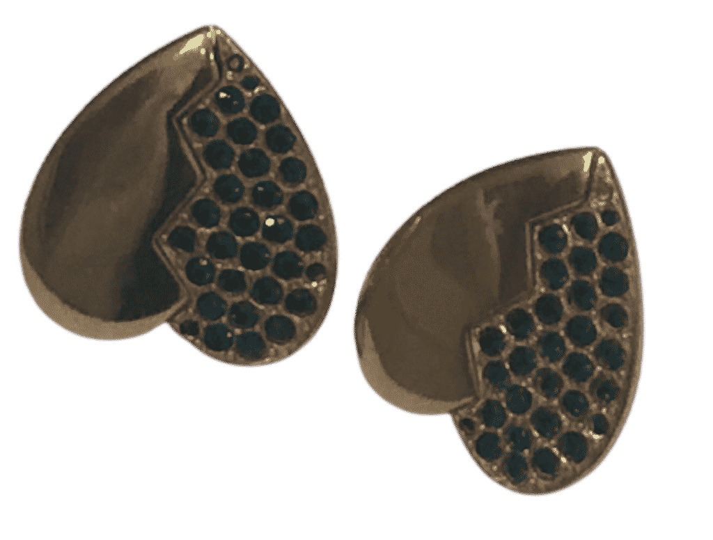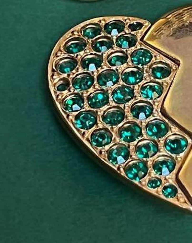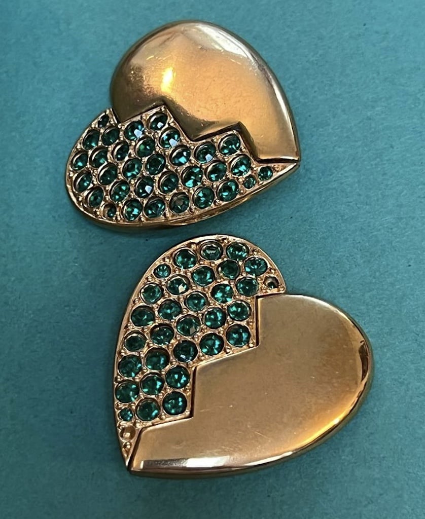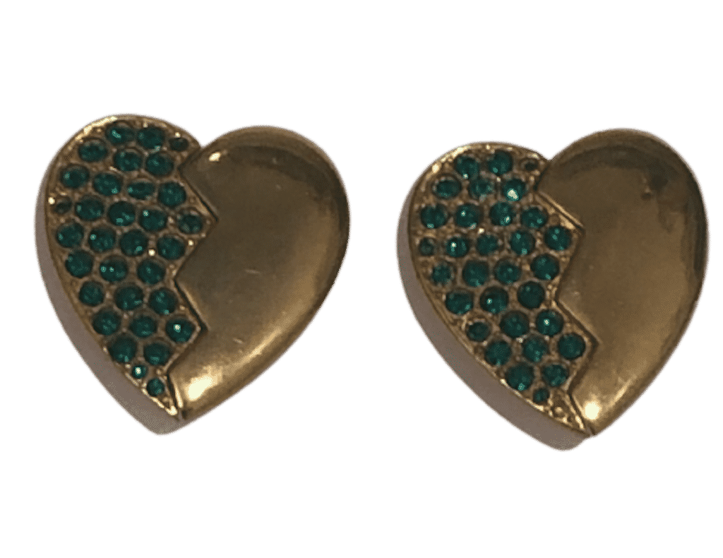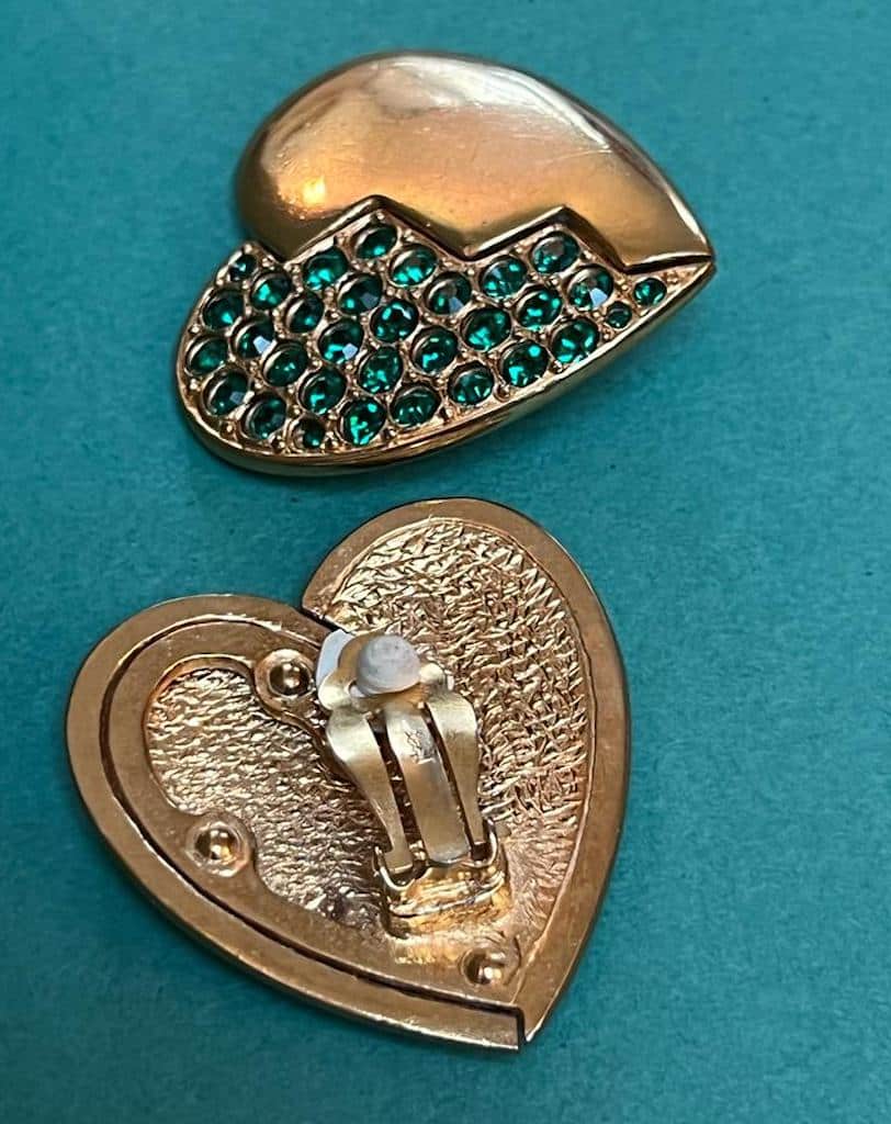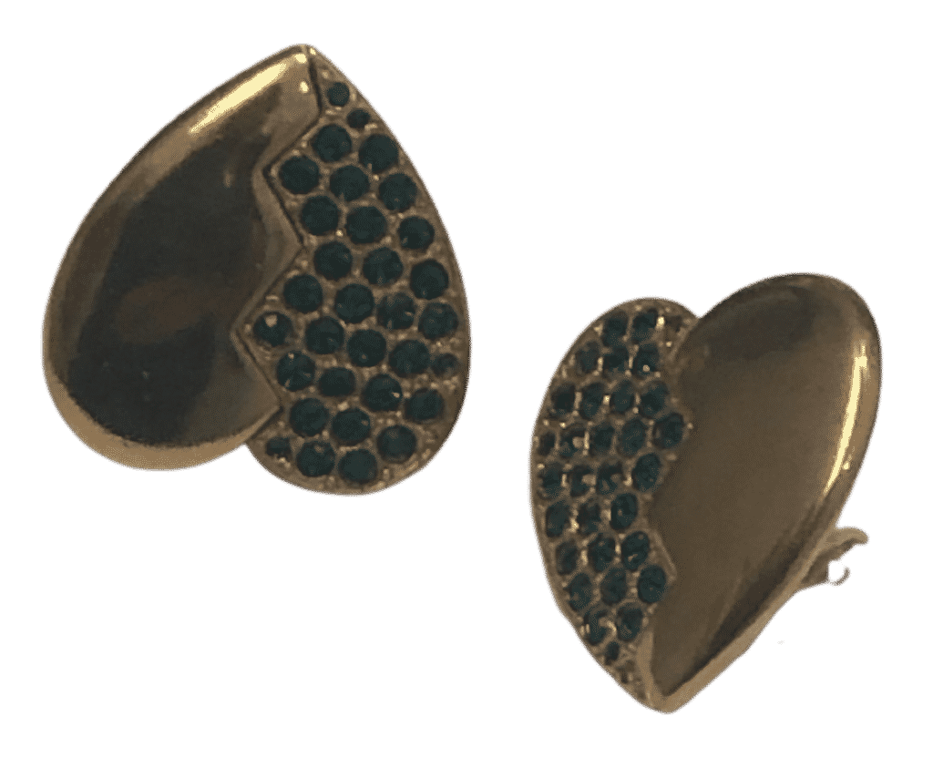A stunning and rare Yves Saint-Laurent, spring/summer 1983, Haute Couture Collection. This amazing large clip-on drop earrings is made by Robert Goossens , heart-shaped with gilt metal and emerald green diamente crystals. A very rare Haute Couture YSL-Goossens ‘Must-Have’.