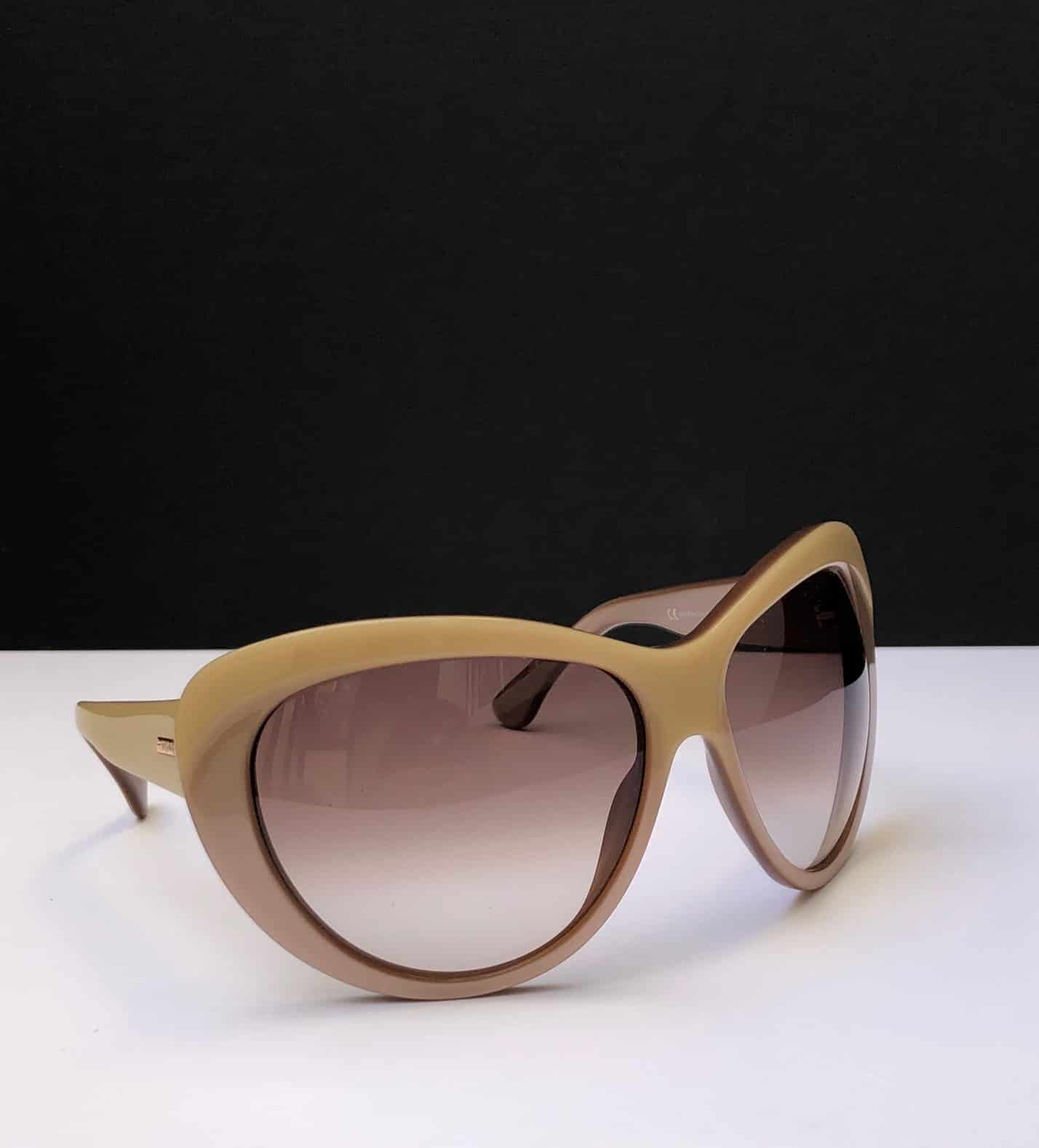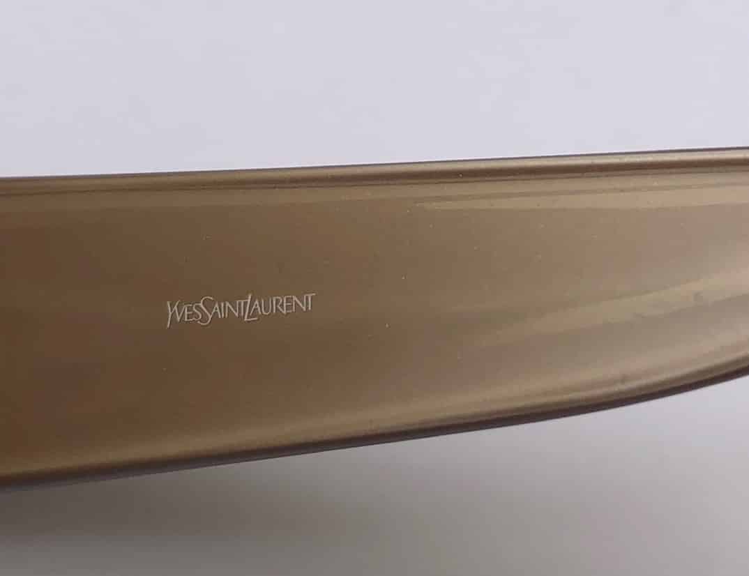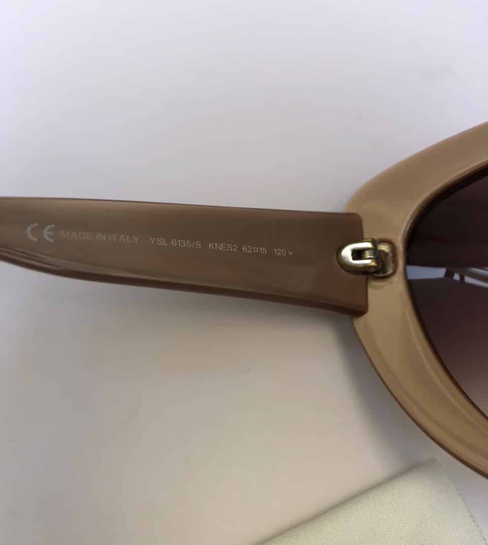 A trendy Yves Saint-Laurent 90s oversized sunglasses in dust cream colour featuring gradient lenses, curved sunglasses, 100% UVA and UVB protection and an embossed logo on each arm.