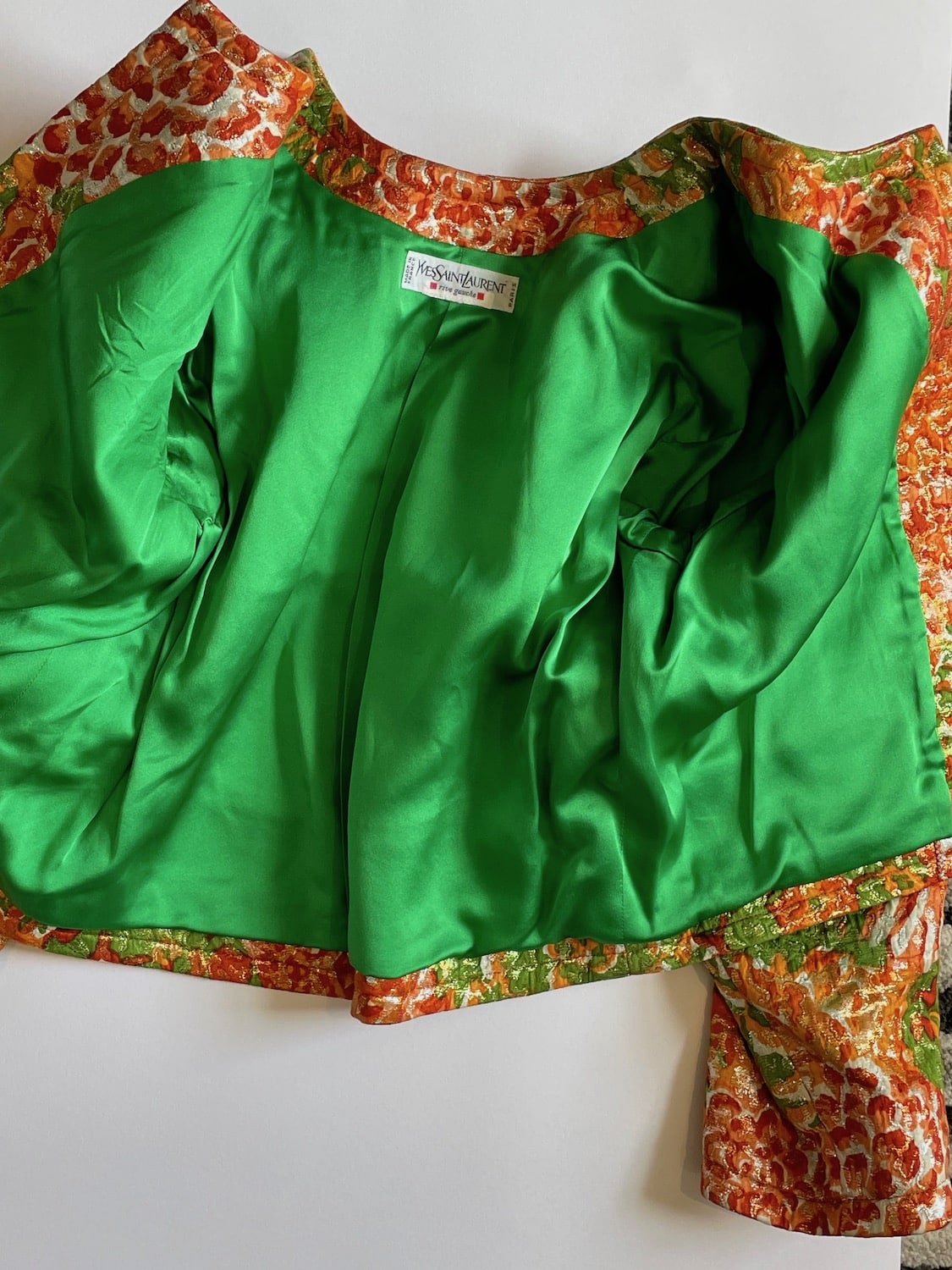 YVES SAINT LAURENT Silk Brocade Lamé Jacket Floral Skirt Suit Runway 1989
