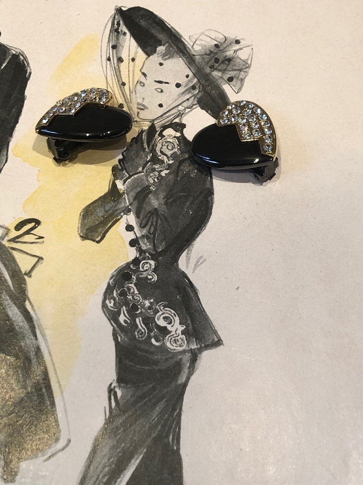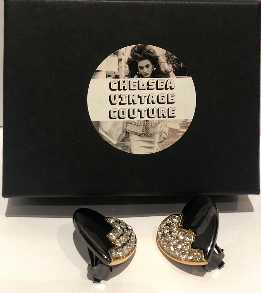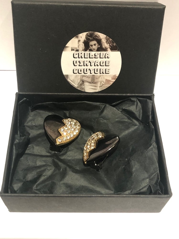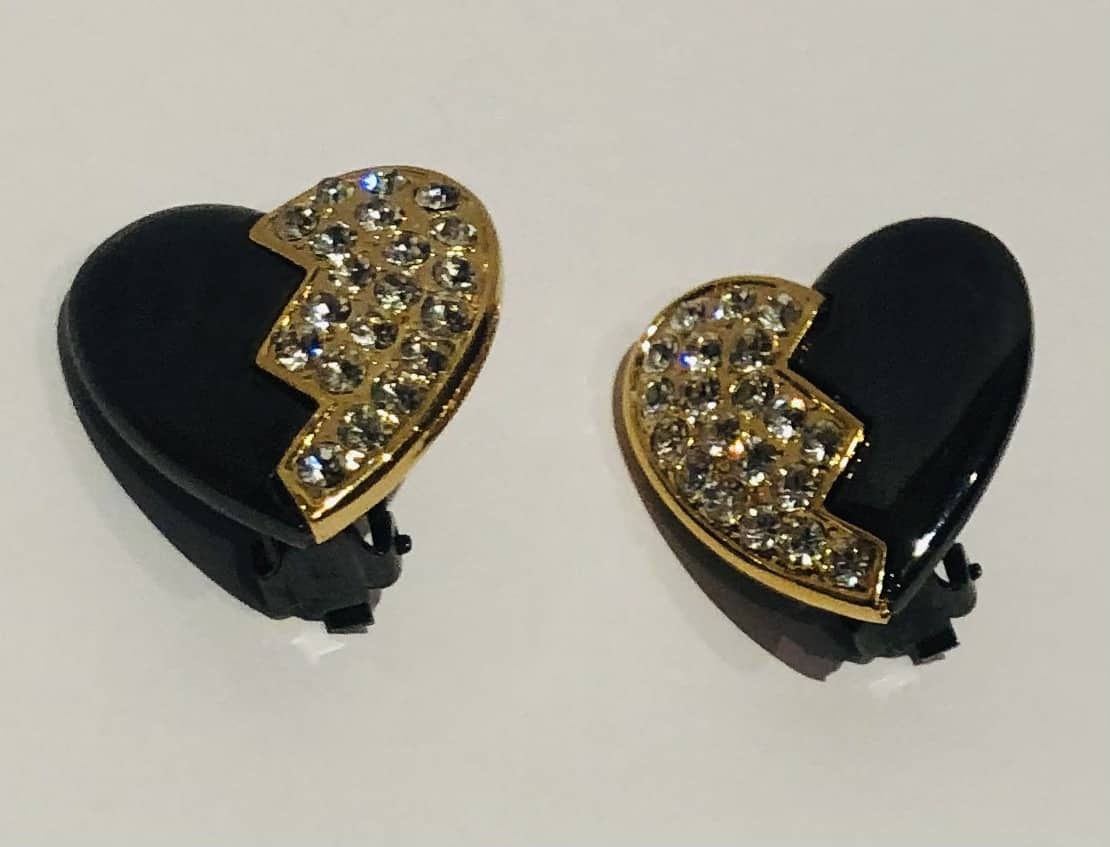 A beautiful vintage pair of Yves Saint Laurent heart clip-on earrings. Made with glossy black enamel Heart on a gold tone with Swarovski crystals. Ideal for this Saint-Valentine.
