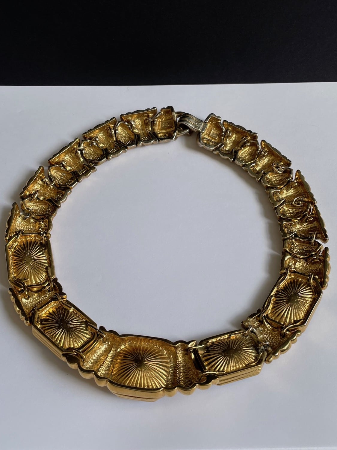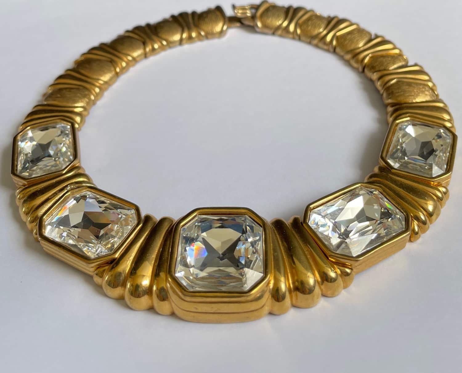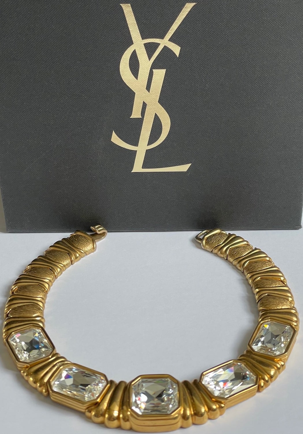 YVES SAINT LAURENT Vintage Gold Plated Emerald Crystal Necklace C.1980