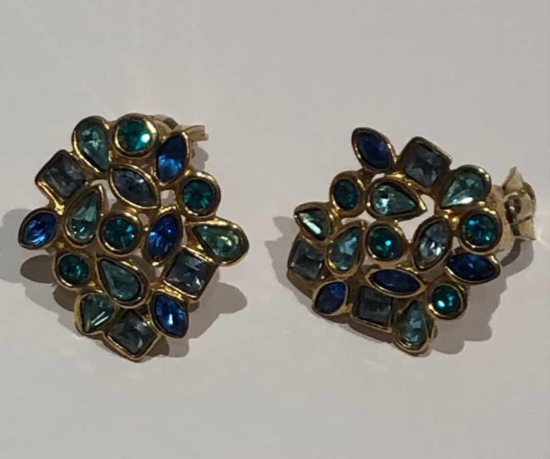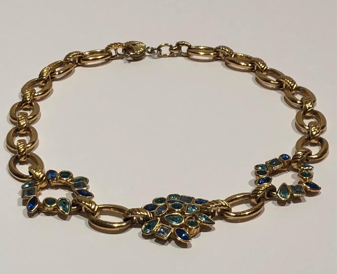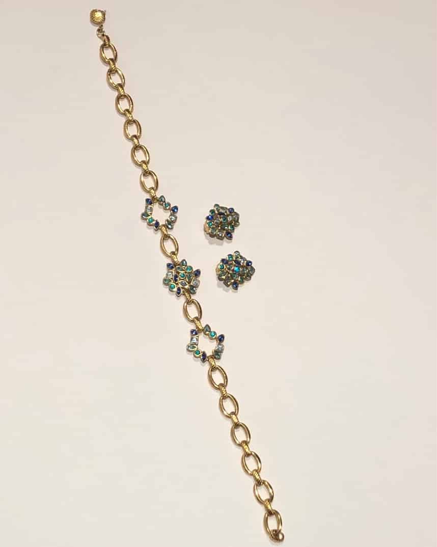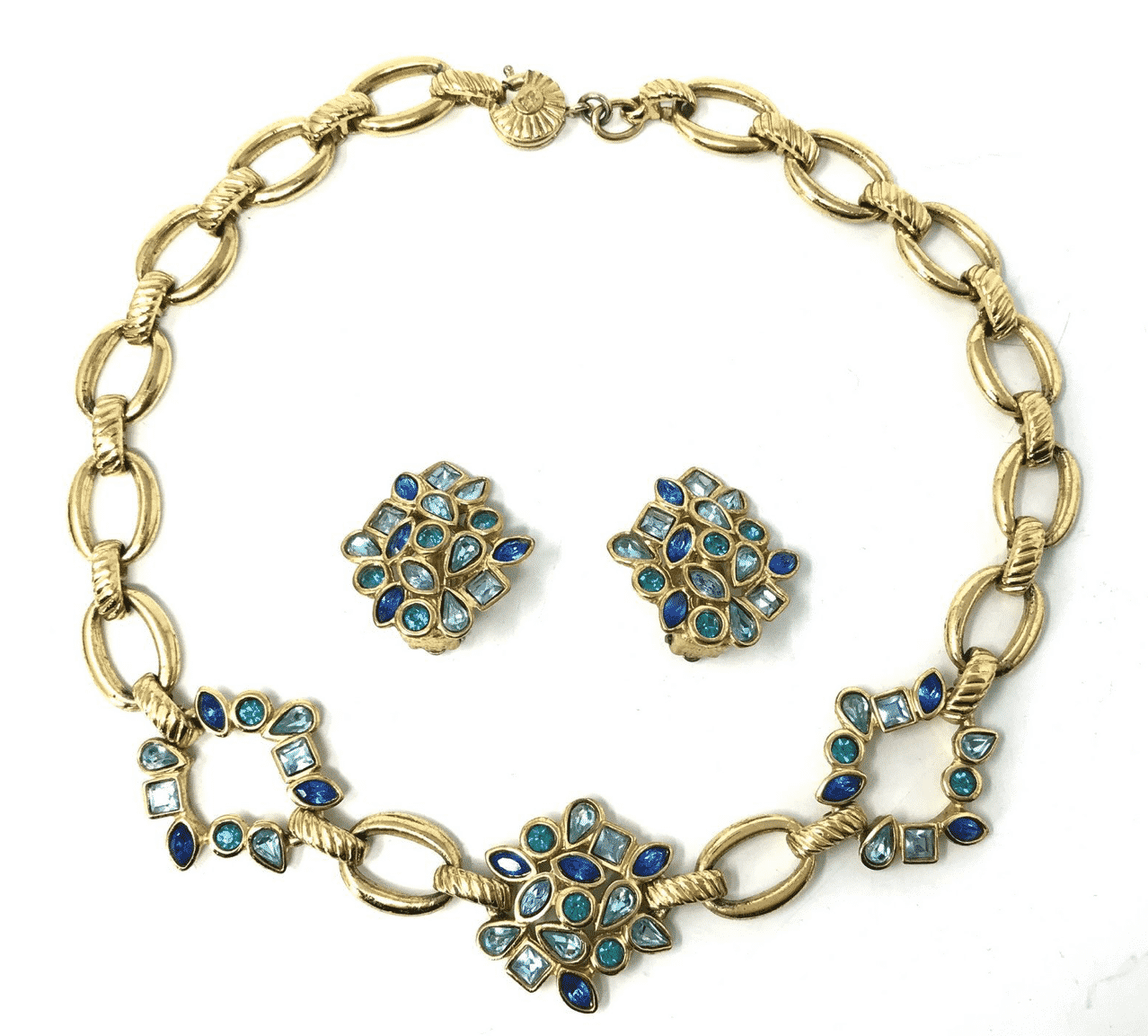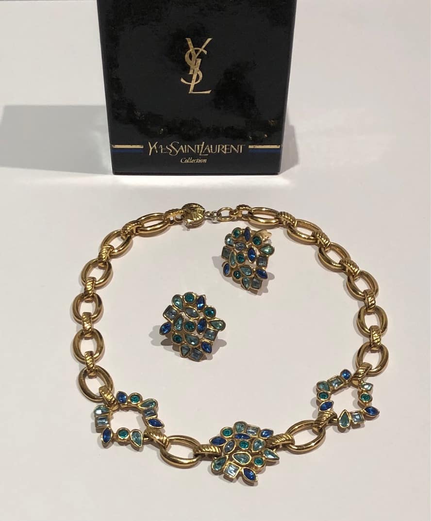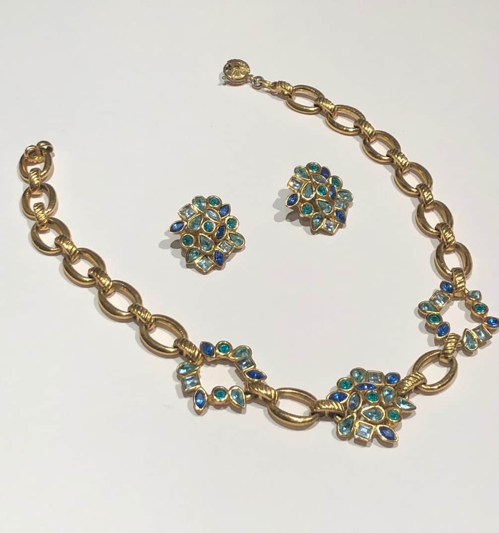 A rare and stunning 90s Yves Saint-Laurent necklace and earrings flower set. The necklace is handcrafted in gold tone oval and filigree chain links set with with three flowers decorated with emerald, aquamarine, sapphire crystals-Gripoix. It closes with a beautiful shell style clasp. flower clip-on earrings in gold tone decorated with emerald, aquamarine, sapphire crystals. In very good condition with the original box and YSL jewellery booklet. Stamped YSL on the back of the earrings and on the necklace clasp. Rare, Must-Have!