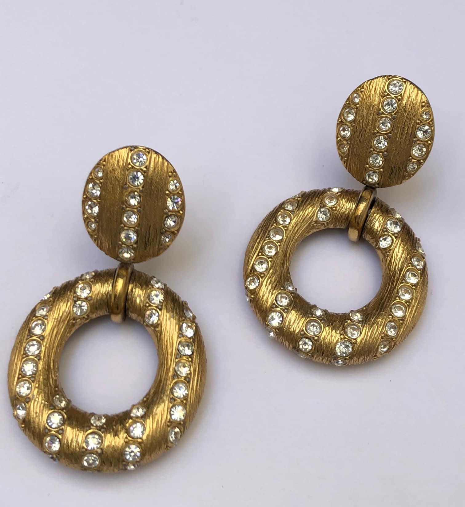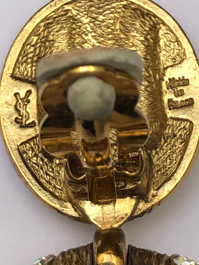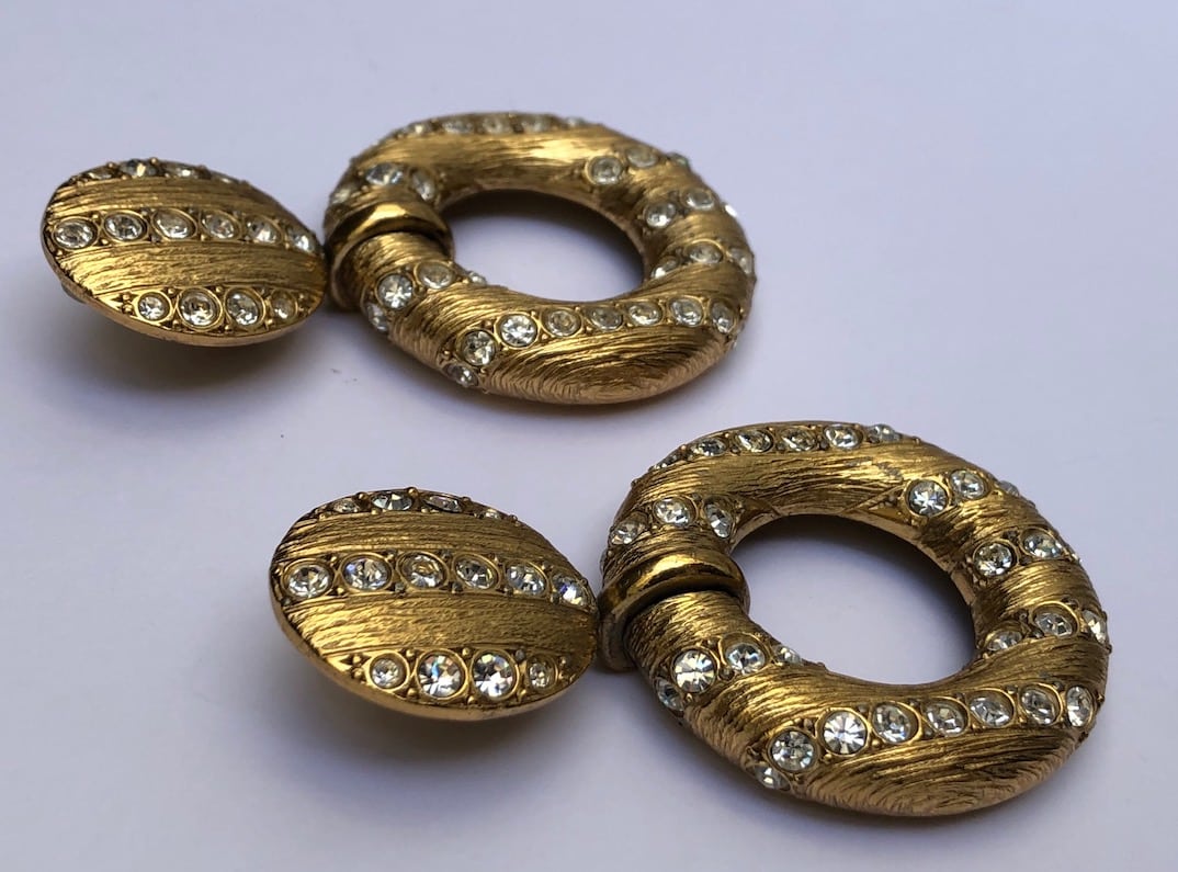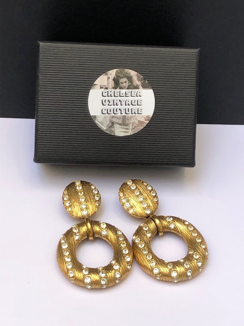Wow! stunning rare, a collector piece, YVES SAINT-LAURENT 80s hoop drop clip-on earrings made by Goossens. Amazing craftsmanship. They are made from gold-tone brass, hammered and set with beautiful diamond cut style with white Swarovski Crystals for a fantastic finish. In perfect condition, a collector piece ‘Must-Have’.