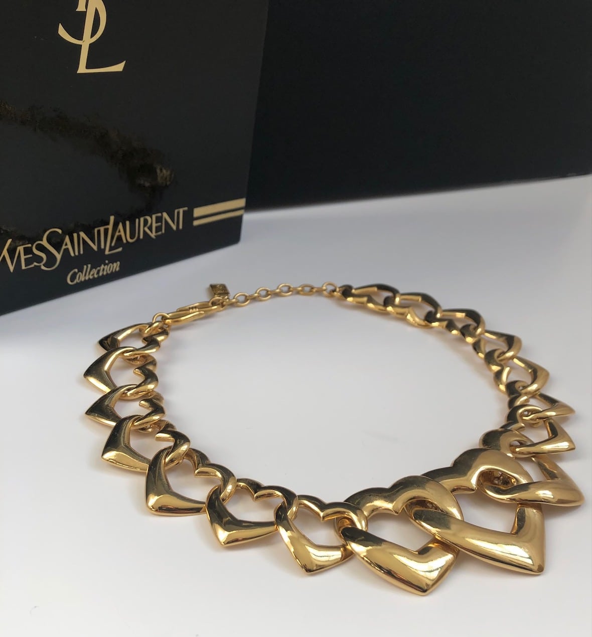 YVES SAINT-LAURENT YSL Gold Heart Statement Necklace C.1980s W/Box