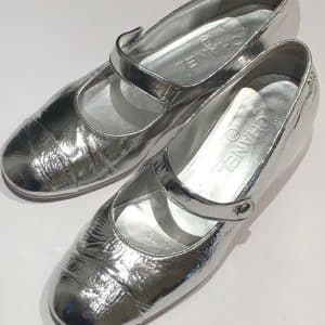 CHANEL Ballerina Flats Laminated Calfskin Silver Crossover Strap Leather Shoes