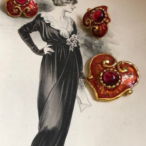 CHRISTIAN LACROIX Earrings And Brooch Pin Set Heart Red Cabochon Vintage 1990s